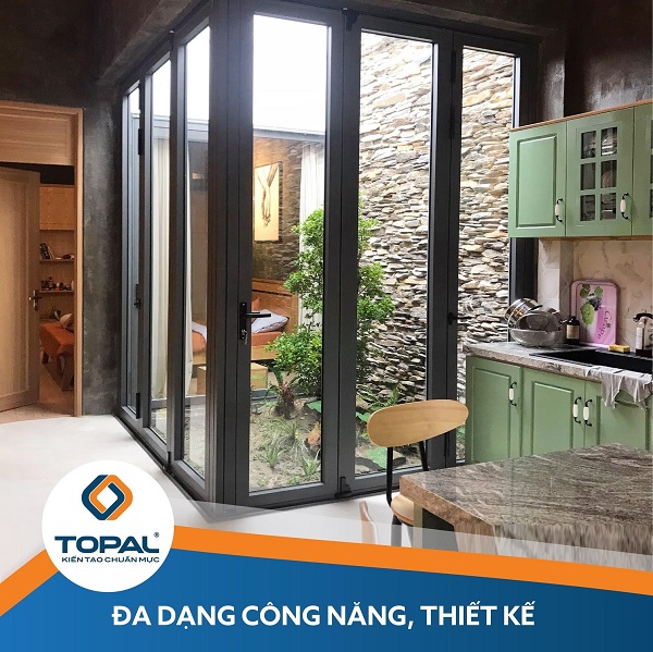 Sự kết hợp các phụ kiện như kim khí Topal giúp cho cửa nhôm Topal có được sự đồng bộ tốt, kín khít, chống ăn mòn và chống gỉ. Có thể chịu được mọi loại thời tiết từ nhiệt độ nắng nóng cho tới mưa bão không thể chạy ngược vào trong.