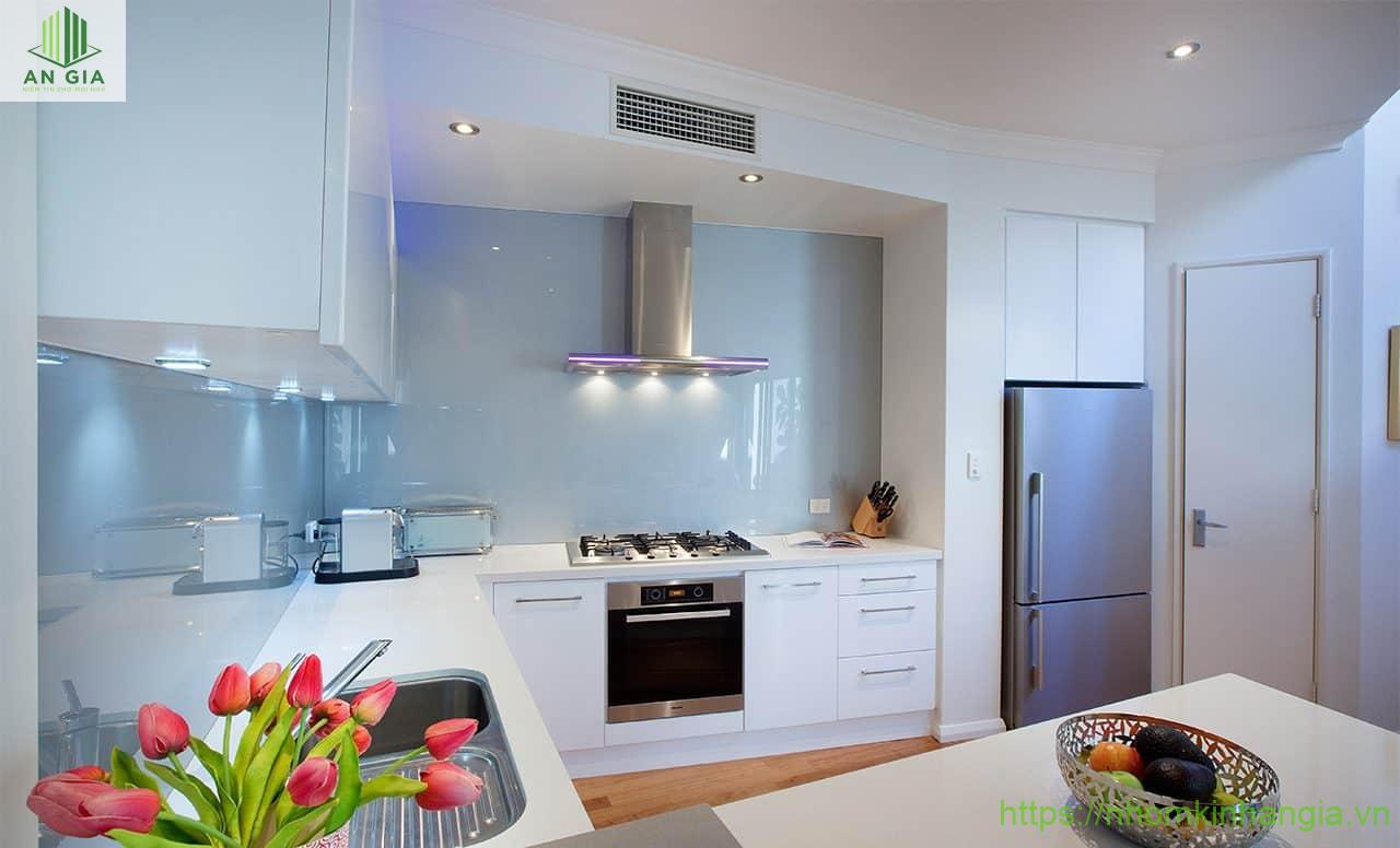 Với những căn nhà theo phong cách sang trọng, hiện đại. ăn bếp sử dụng kính ốp màu trắng sữa là một lựa chọn vô cùng hoàn hảo. Gam màu trắng sữa thể hiện được rõ vẻ đẹp mềm mại; tinh tế, nhã nhặn; khiến căn bếp trở nên ấm cúng hơn trong mỗi bữa cơm gia đình.